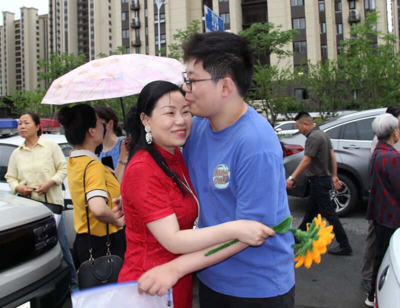 “抱一下,祝我兒子一舉奪‘葵’!”考點前,前來送考的王女士和兒子高福暖暖擁抱,并把一朵向日葵送給兒子!鞍謰,我不緊張,你們別擔(dān)心!备吒=o了父母一個爽朗的笑容,信步走向考場。王女士告訴記者,孩子在淮南一中上學(xué),學(xué)的是理科,“我們沒有給他什么壓力,所以他的心態(tài)還不錯,人生大考還是要拼心態(tài)!鄙碇蠹t色旗袍的王女士表示,帶著葵花來給孩子打氣,希望他能取得好成績。
