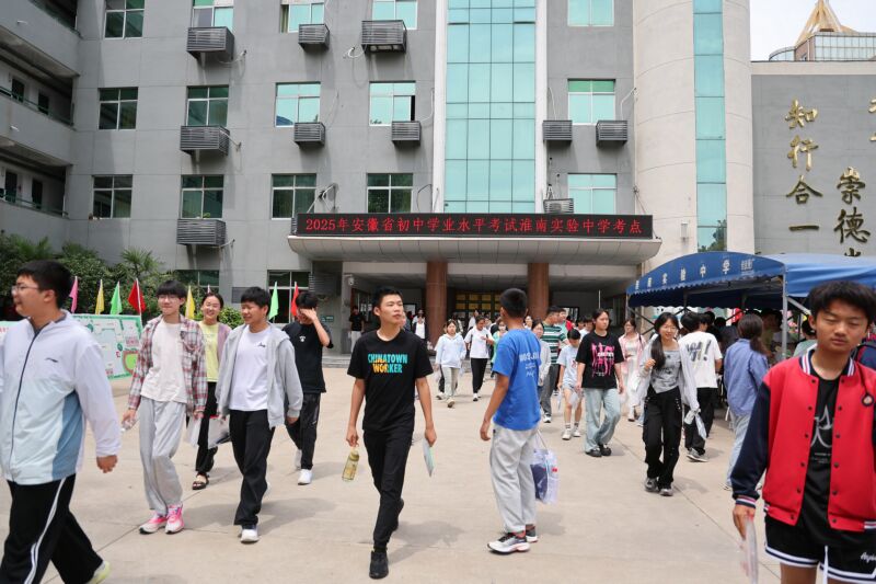 6月14日,為期三天的2025年安徽省初中學(xué)業(yè)水平考試開考。我市共有40362名考生報(bào)名應(yīng)試,他們將分布在27個(gè)考點(diǎn)、1348個(gè)考場(chǎng)參加考試。圖為6月15日中午,參加完數(shù)學(xué)科目考試的學(xué)生走出考點(diǎn)。