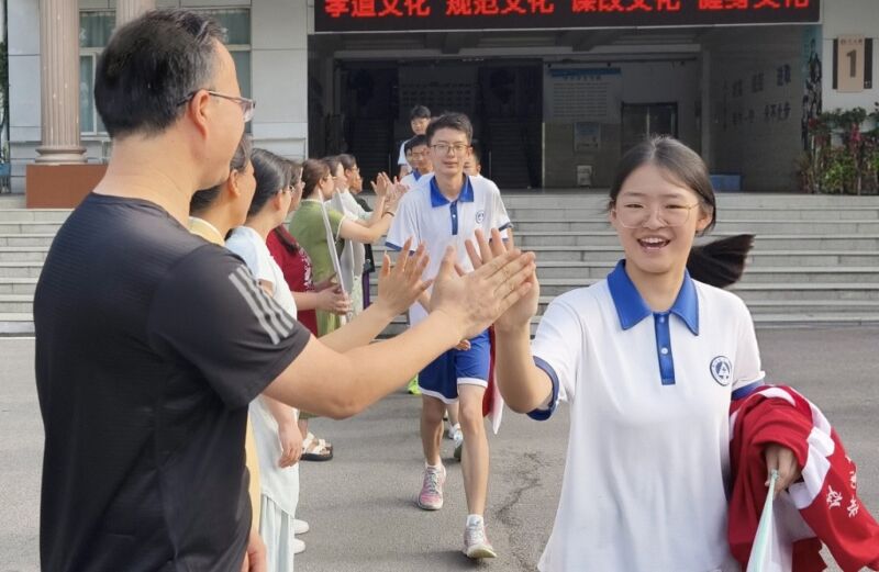 “文具再確認一遍,準考證收好!”老師輕聲提醒,目光逐一掃過學生證件,對每一個細節(jié)進行檢查。老師們伸出手掌,以清脆的擊掌傳遞信心:“穩(wěn)住,沒問題!”“好好審題,等你們凱旋!”溫暖的笑容和簡短的叮囑,如微風般拂過略顯緊張的臉龐。還有家長特意備好手寫祝?ㄆ那难b進孩子的口袋——“從容落筆,靜待花開”,紙短情長,字字暖心。家長或踮腳張望,或輕拍肩膀,所有牽掛盡在不言中。