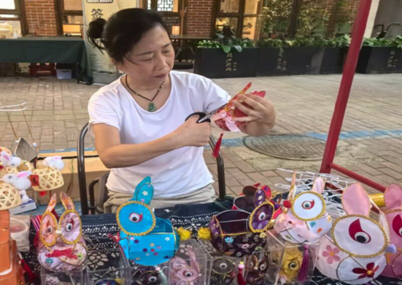 今年快60歲的沈長鳳與燈彩的緣分,始于童年時那個總飄著彩紙和竹香的小院。小時候,她常蹲在長輩身邊,看他們將細(xì)竹篾彎折成各種動物的骨架,再用染色的宣紙細(xì)細(xì)裱糊。彩紙在他們手中仿佛被施了魔法,一盞盞平淡無奇的燈,經(jīng)過勾勒點染,瞬間變得流光溢彩、生動起來。起初,她只是好奇,跟著摸摸材料、遞遞剪刀,在一旁模仿著,胡亂扎些不成形的小玩意,卻不知不覺被這門光影交錯的藝術(shù)深深吸引。