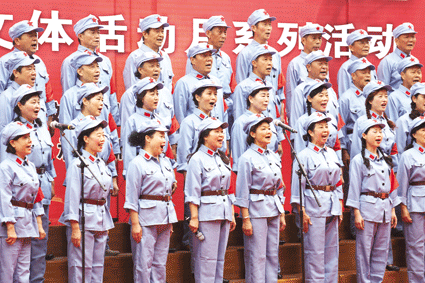“橫斷山,路難行。天如火來水似銀。親人送水來解渴,軍民魚水一家人!碑(dāng)天下午3時(shí),文藝演出在大合唱:長(zhǎng)征組歌節(jié)選《四渡赤水出奇兵》中拉開帷幕。