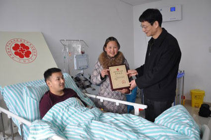 中華骨髓庫安徽分庫工作人員趕到病房看望了他,為他頒發(fā)了《捐獻造血干細胞榮譽證書》,并告訴史柯:“因為你的無私奉獻,一個鮮活的生命得到了拯救,你很偉大!”工作人員還為史柯送來一份特別的禮物,那是受捐者家屬寫的一封感謝信:“滴水之恩,涌泉相報”。這簡單的八個大字,對史柯來說,無疑是最高的獎賞,更是對他無私奉獻最好的詮釋。