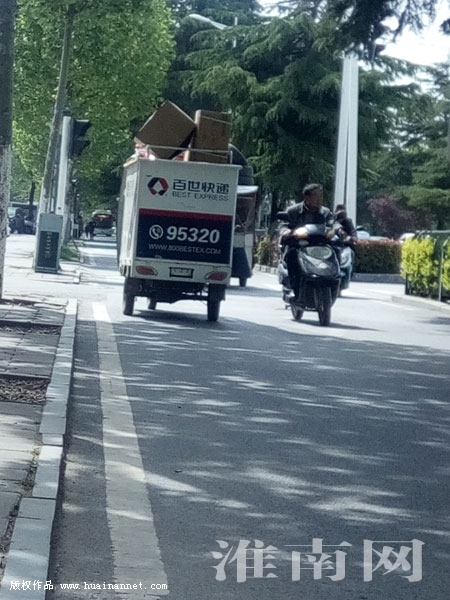 圖一、一輛快遞電動(dòng)三輪車司機(jī)在公交車專用道上逆行。