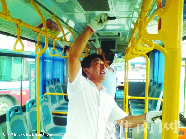 圖:維修人員對(duì)公交車廂扶手進(jìn)行檢修