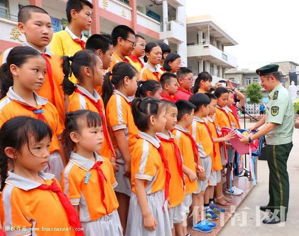 圖一:2018年5月31日,福建省惠安崇武西華小學內(nèi),崇武邊防派出所指導員孫進為優(yōu)秀學生頒發(fā)武進成捐助的書包。(圖片由福建省惠安縣螺城鎮(zhèn)文化站張錦宣攝)