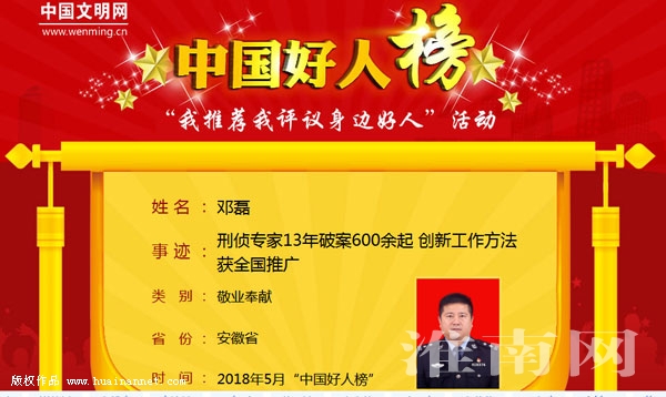 好人是照亮我們前行的“明燈”,模范是給我們榜樣力量的“大樹”,在他們身上閃光的是高尚的品行。他們引領(lǐng)一方風(fēng)氣!日前,中央文明辦在延安舉辦全國道德模范與身邊好人現(xiàn)場交流活動,并發(fā)布了5月“中國好人榜”,刑偵專家鄧?yán)趧?chuàng)立追逃工作法做有案必破的守護(hù)神,上榜2018年5月“中國好人榜”。
