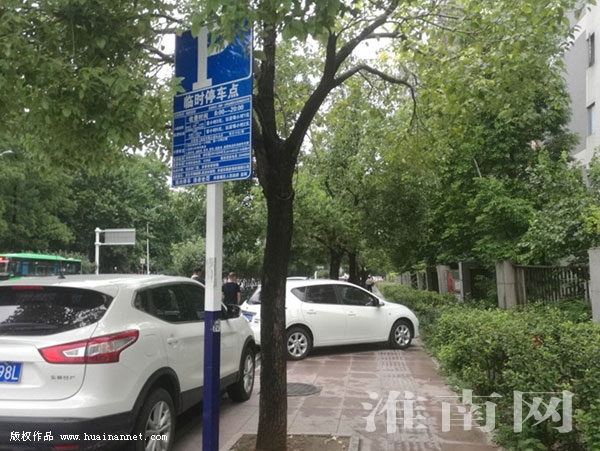 在淮河大道東側(cè)洞山新村路段的人行道上,一輛白色小轎車(chē)斜停在人行道上,將人行道攔腰擋。ㄈ鐖D),而一旁的非機(jī)動(dòng)車(chē)道則劃有停車(chē)位,還豎有臨時(shí)停車(chē)點(diǎn)的牌子。 (記者)