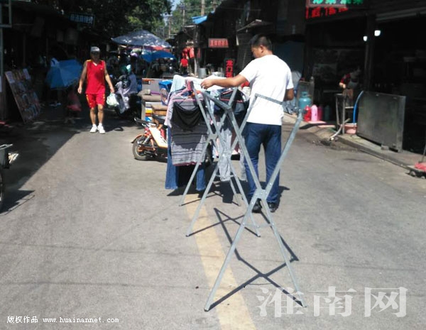 洞山基地美食街是一條步行街,每天居民買菜、買早點等都要經(jīng)過此街。7月19日上午9時30分,淮河早報、淮南網(wǎng)記者途經(jīng)這條街時,看見路中間被晾曬上了衣服。(記者)