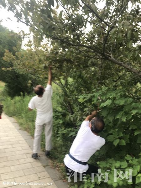 7月24日下午5時17分,淮河早報(bào)、淮南網(wǎng)記者在舜耕山風(fēng)景區(qū)老龍眼濕地看到這樣一幕:在老龍眼水庫邊一棵桃樹頂端結(jié)著幾個毛桃,兩名老年男子路過時發(fā)現(xiàn)了樹頂?shù)奶易樱捎谔易雍芨,其中一名男子便拉扯桃樹一個枝椏,把樹枝壓低,讓另一名男子摘取桃子。