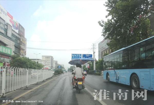 8月6日上午10時左右,在謝家集區(qū)蔡新路等一些主要路段,許多摩托車、電動車都“撐傘”上路。