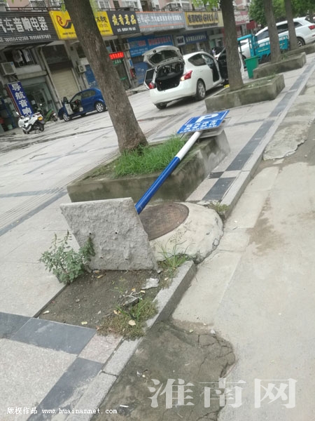 8月20日,淮河早報(bào)、淮南網(wǎng)記者經(jīng)過朝陽西路銀鷺萬樹城小區(qū)旁看到,一塊停車指示牌傾倒在路邊,指示牌底部還有一塊大理石道板(如圖)。(記者)