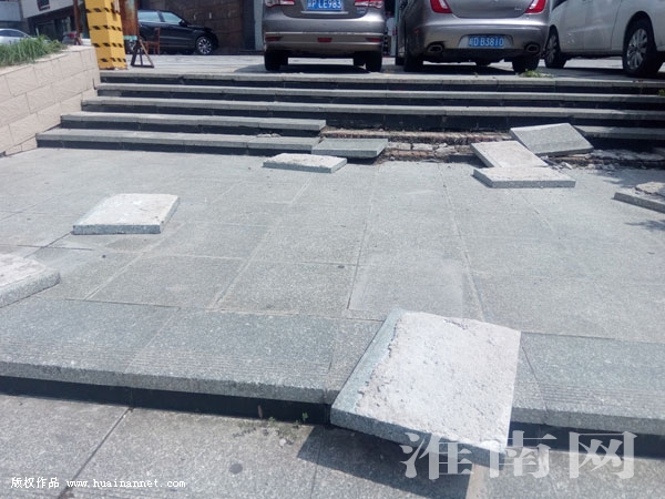 近日,淮河早報(bào)、淮南網(wǎng)記者在淮河大道東邊人行道看到,一階梯上所裝飾的大理石道板遭到人為破壞,被敲掉扔在地面上。(記者)