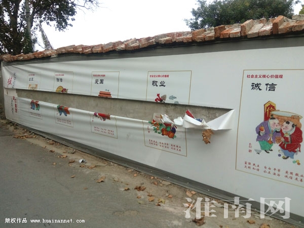 10月22日下午,淮河早報(bào)、淮南網(wǎng)記者途經(jīng)安防小巷,看到一幅粘貼在墻面上的公益宣傳畫,不知何時(shí)被人用刀劃開一條長約6米的大口子,致使美觀的公益畫被破壞得的面目全非。(記者)