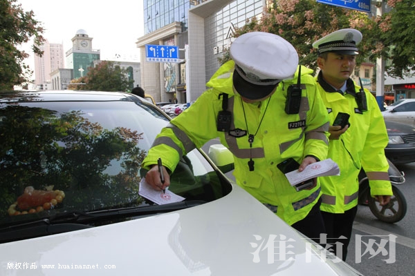 圖一:民警現(xiàn)場對違停車輛開出罰單。