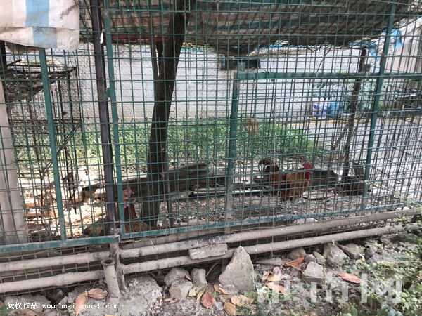順著小區(qū)的主干道繼續(xù)走下去,除了小片的綠地被開墾成菜園外,還有一些自行搭建的簡易棚,幾戶居民家門口都有這種簡易棚,棚子里擺放的都是一些桶、家具、木材等雜物。而在另幾幢樓前,淮河早報、淮南網(wǎng)記者看到了兩戶門前用鐵網(wǎng)拉成的柵欄墻,柵欄墻里是幾只雞在來回踱步,時不時低頭找食吃。