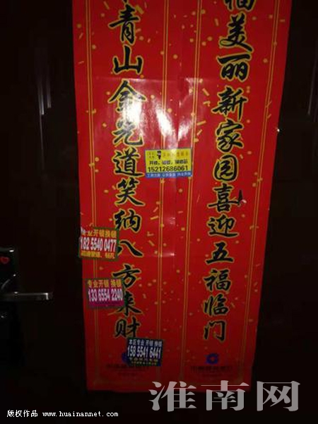 最近,創(chuàng)城工作已深入人心,許多貼在墻上的小廣告都被鏟除,可這些貼小廣告的人并沒有撒手,竟把小廣告貼在了市民家門上或是大門對聯(lián)上,影響美觀不說,還特別不容易去除。圖為青水灣小區(qū)一戶居民家對聯(lián)上被貼上小廣告。(記者)
