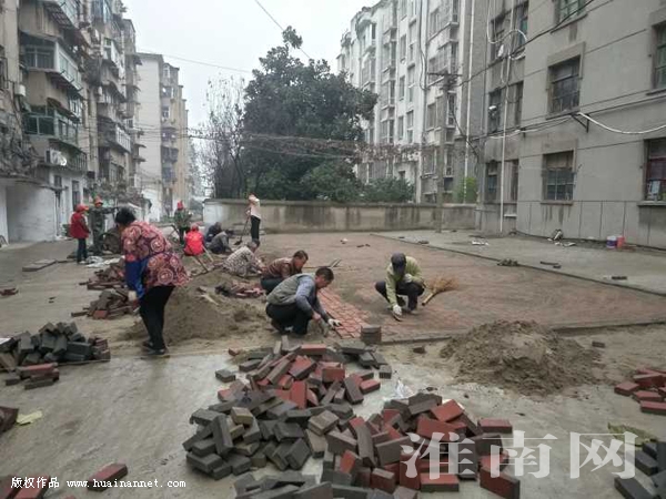 圖一:在無物管的居民區(qū)內(nèi),工人們正在加緊修建休閑活動廣場。