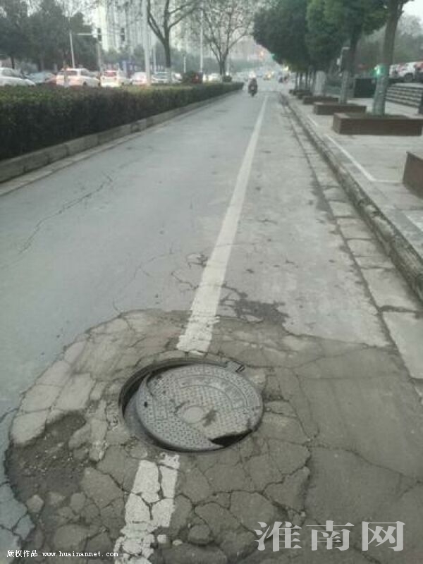 在朝陽路與廣場路交叉路口西邊北側的非機動車道上,有一處窨井蓋破損斷裂,靠防墜網(wǎng)兜著,存在安全隱患。(記者)